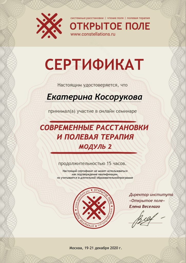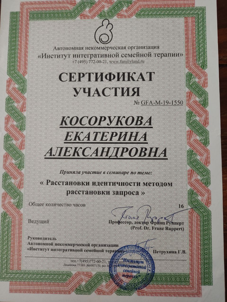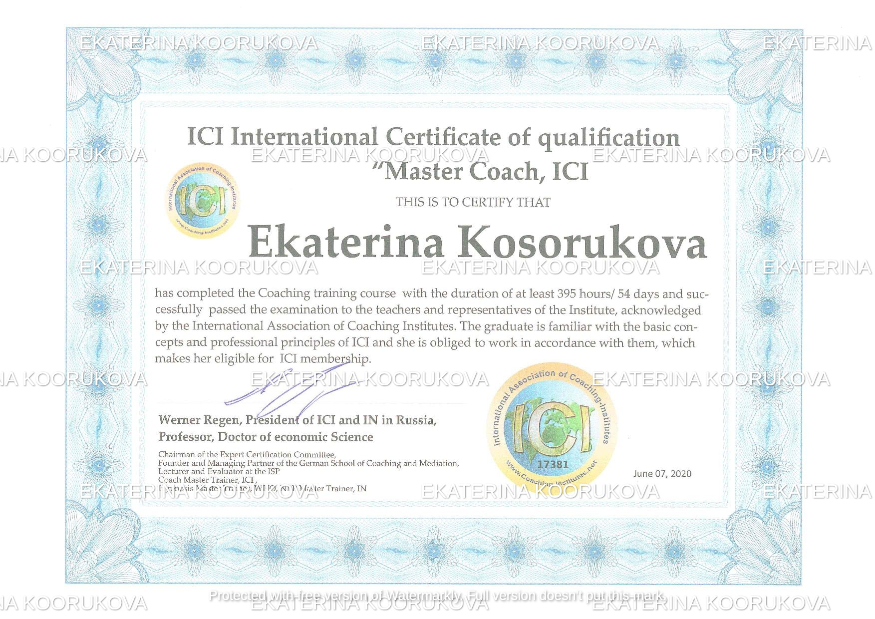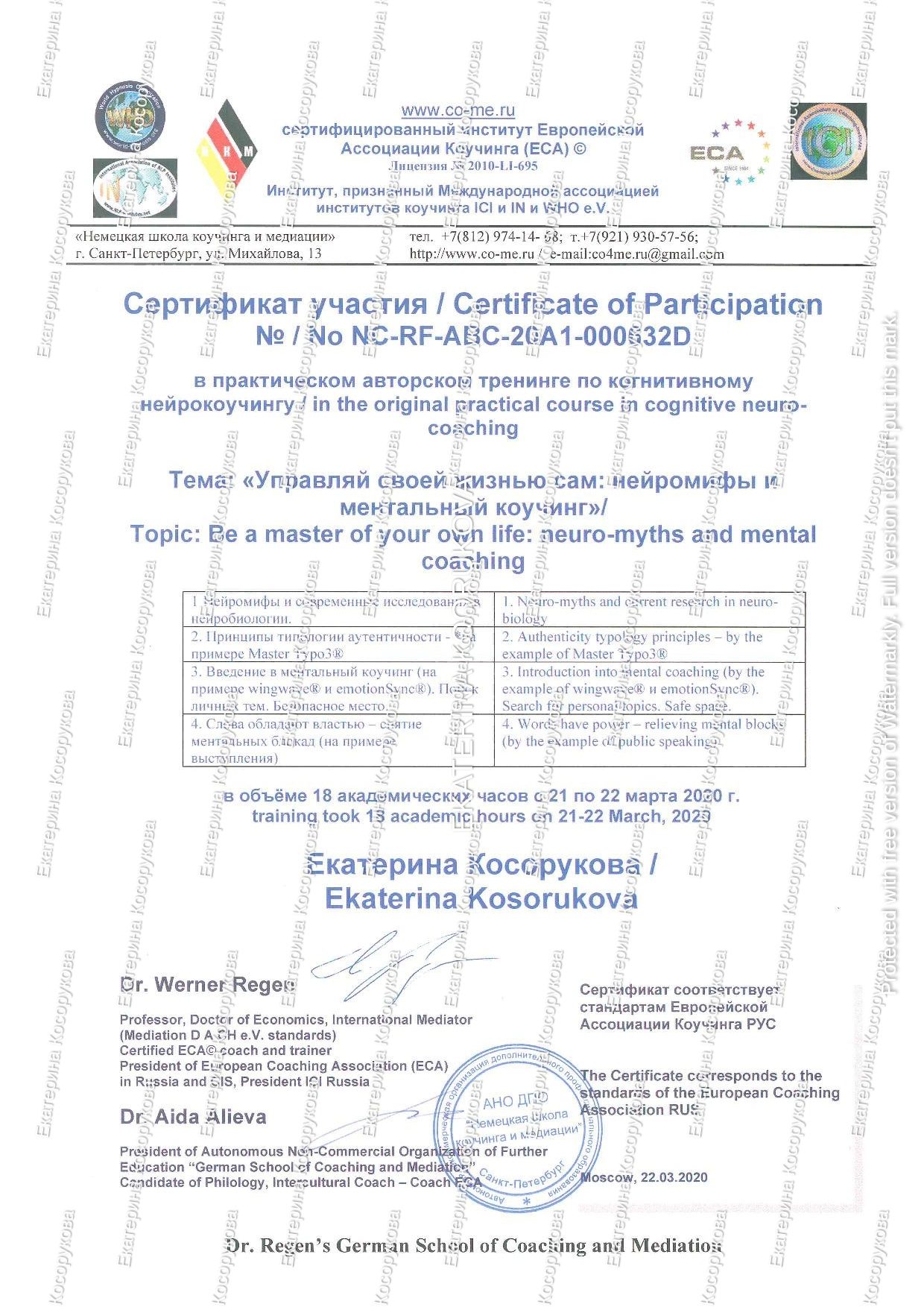 ▶ International Certification. “Neurocoaching and Neuropsychology: Modern Approaches in Neurolinguistics,” Moscow Institute of Psychoanalysis, ICI International Certification of qualification “Master Coach”, ICI, №17381