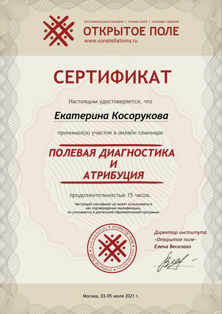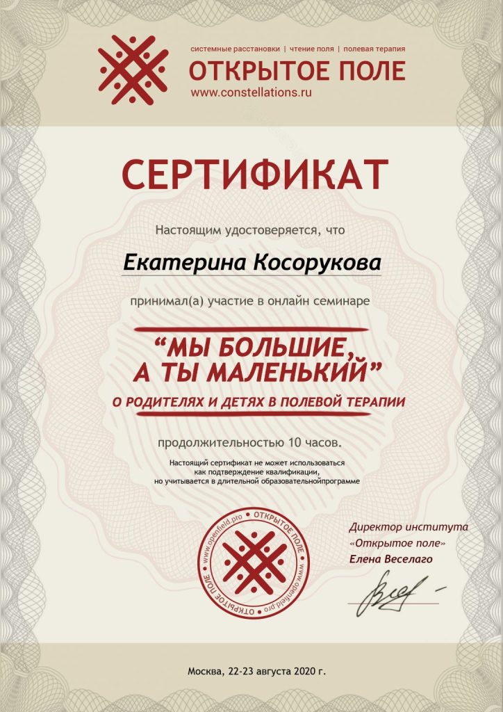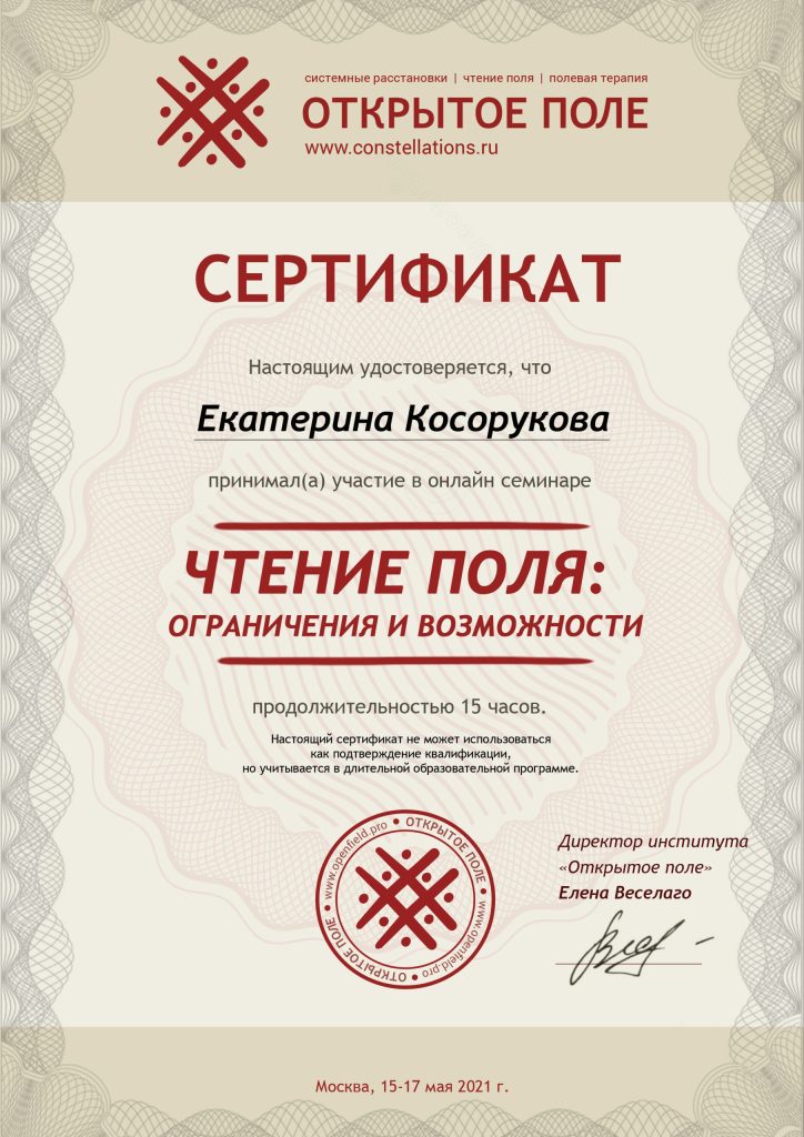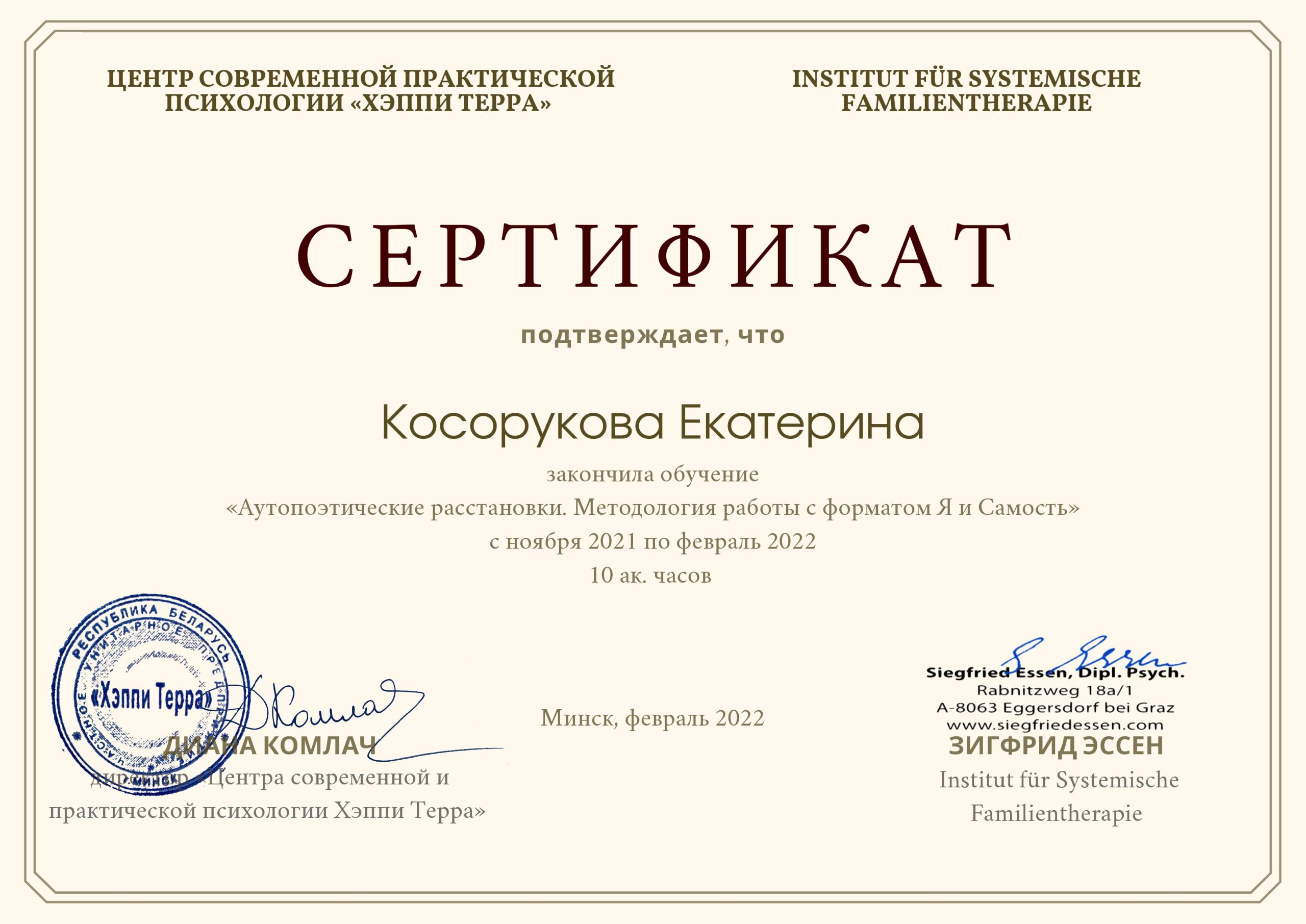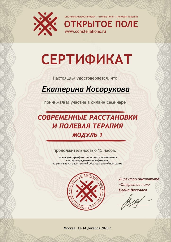 ▶ International Certification. “Neurocoaching and Neuropsychology: Modern Approaches in Neurolinguistics,” Moscow Institute of Psychoanalysis, ICI International Certification of qualification “Master Coach”, ICI, №17381