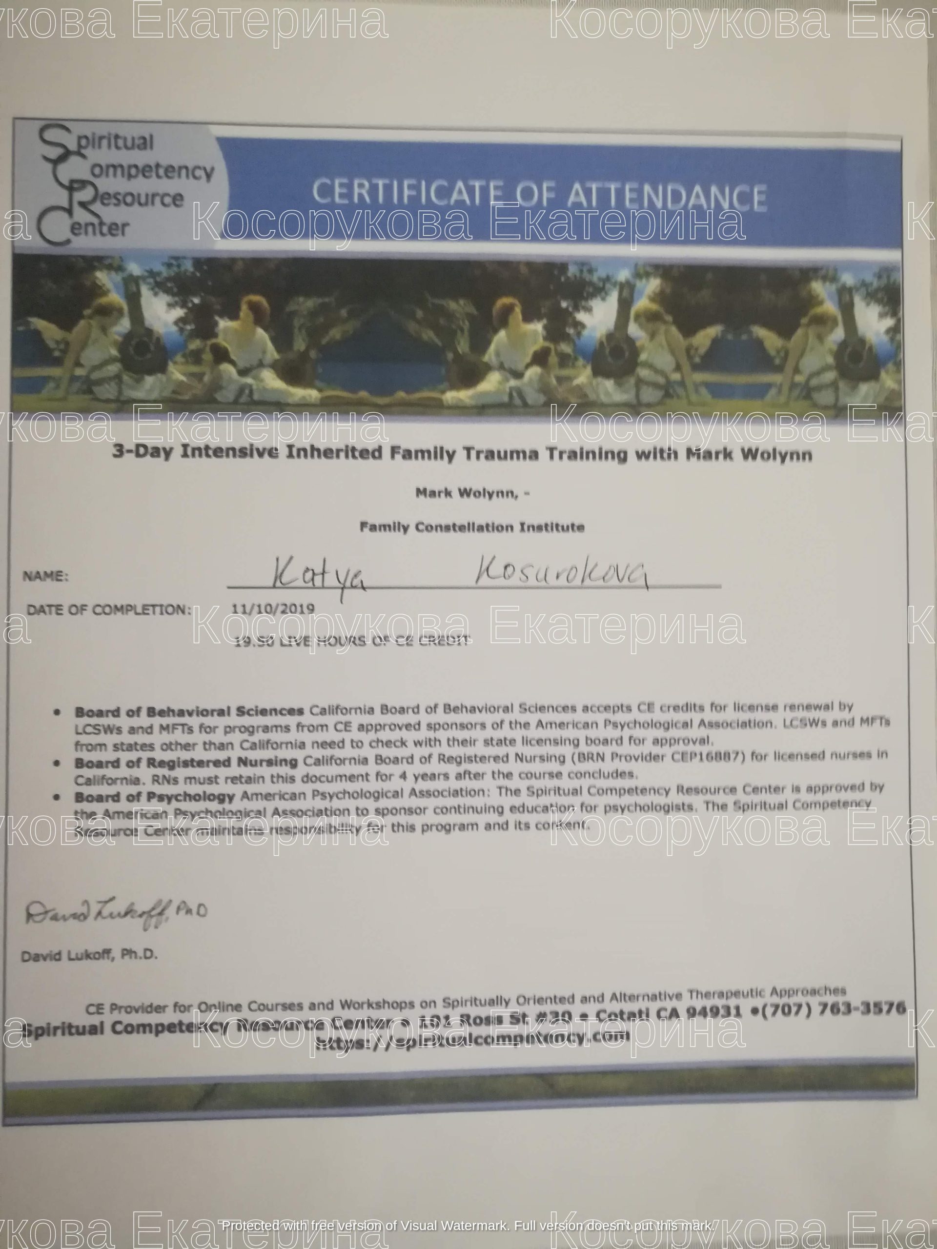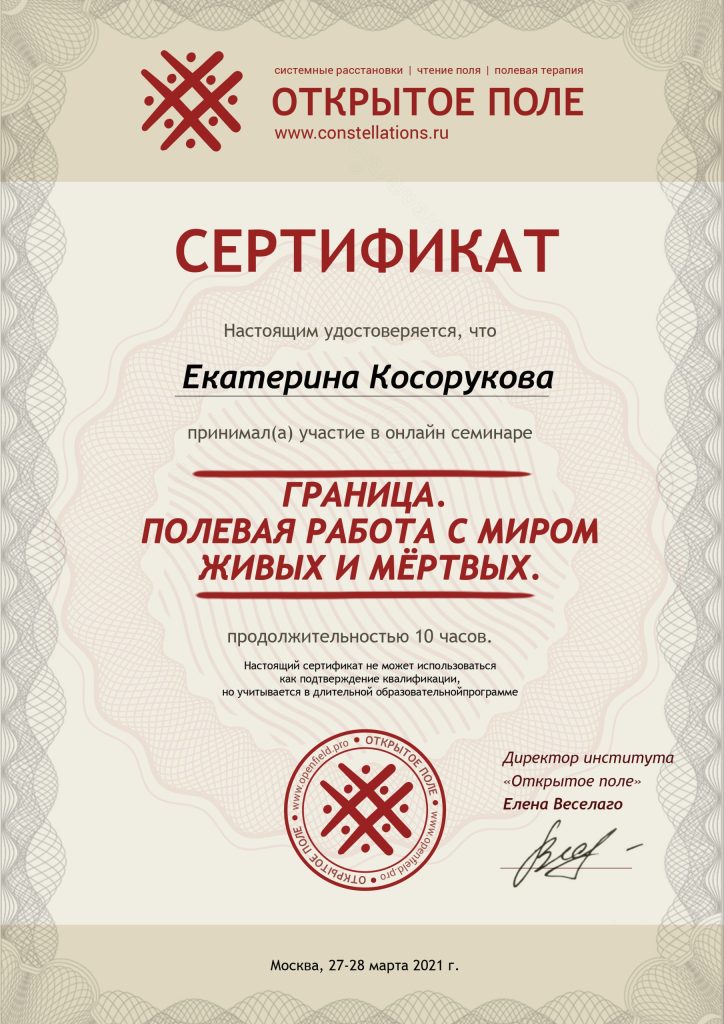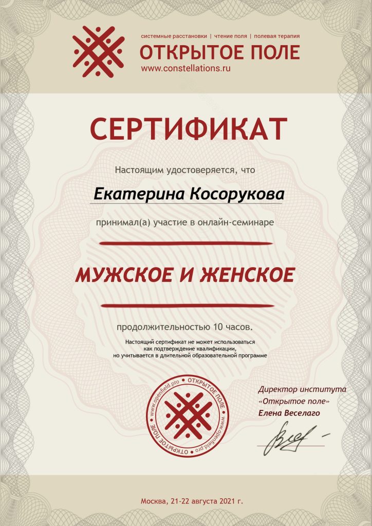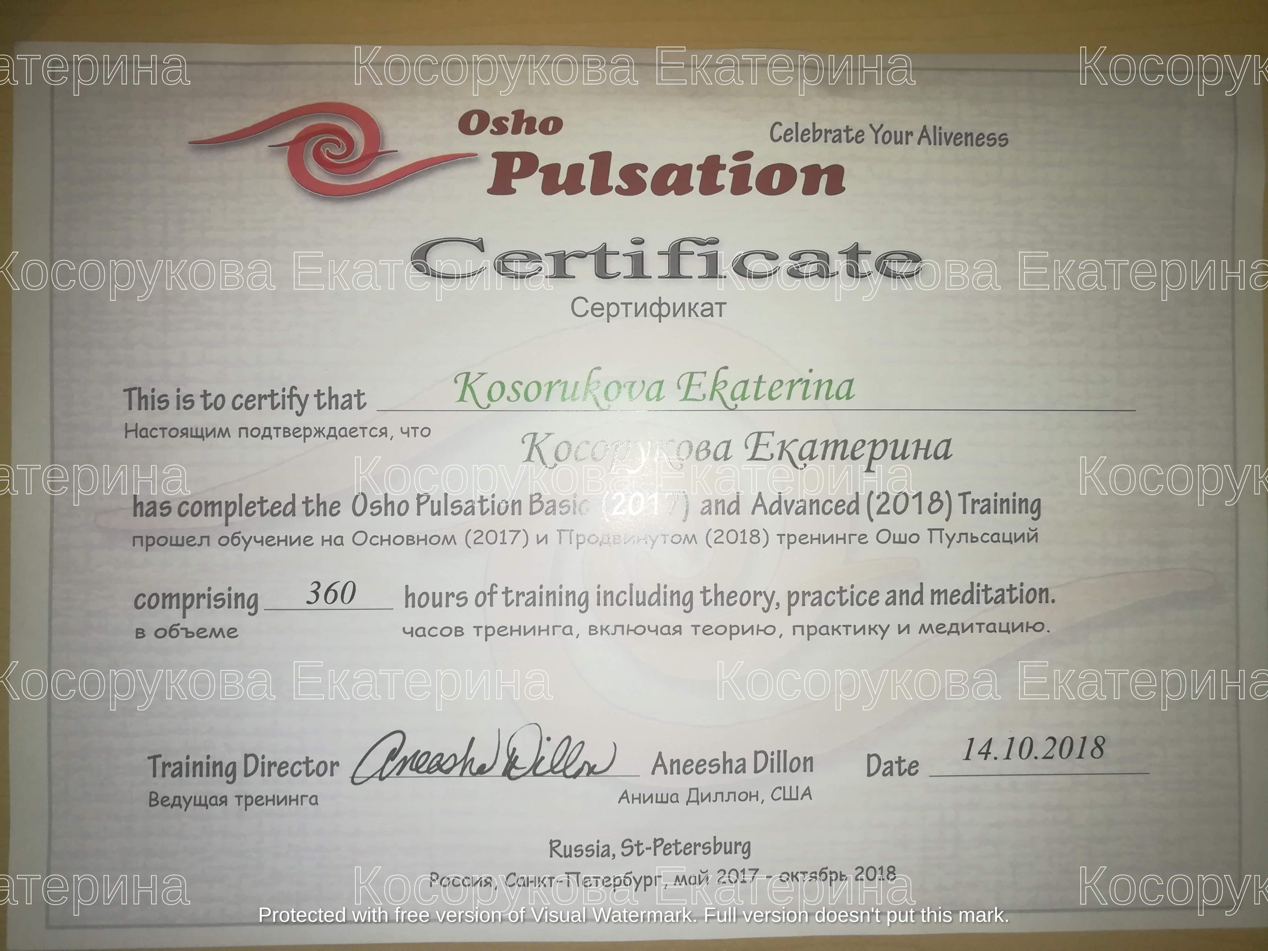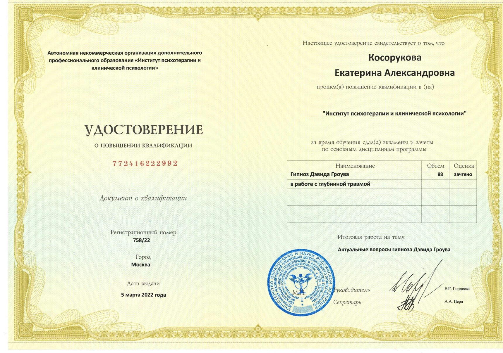 ▶ International Certification. “Neurocoaching and Neuropsychology: Modern Approaches in Neurolinguistics,” Moscow Institute of Psychoanalysis, ICI International Certification of qualification “Master Coach”, ICI, №17381