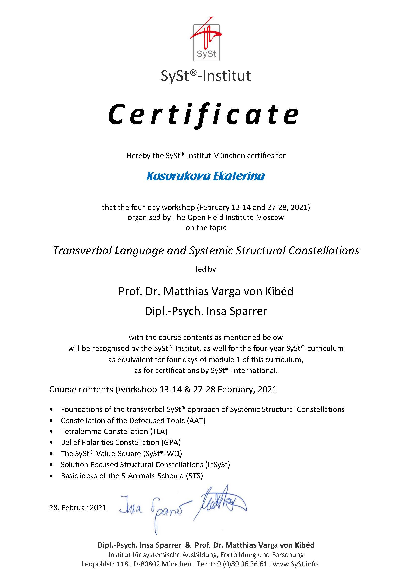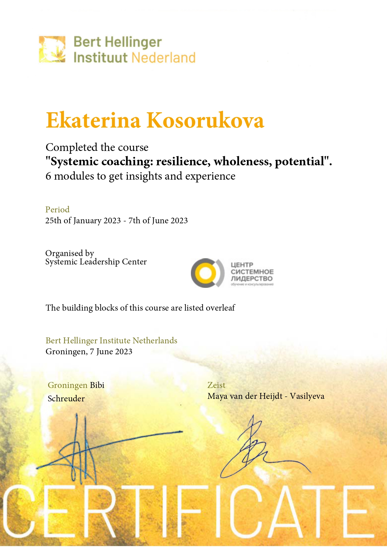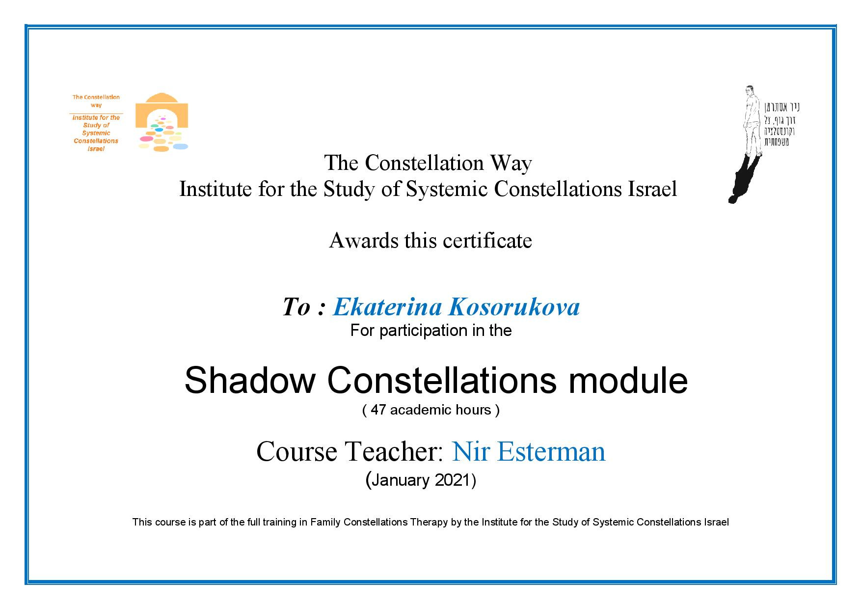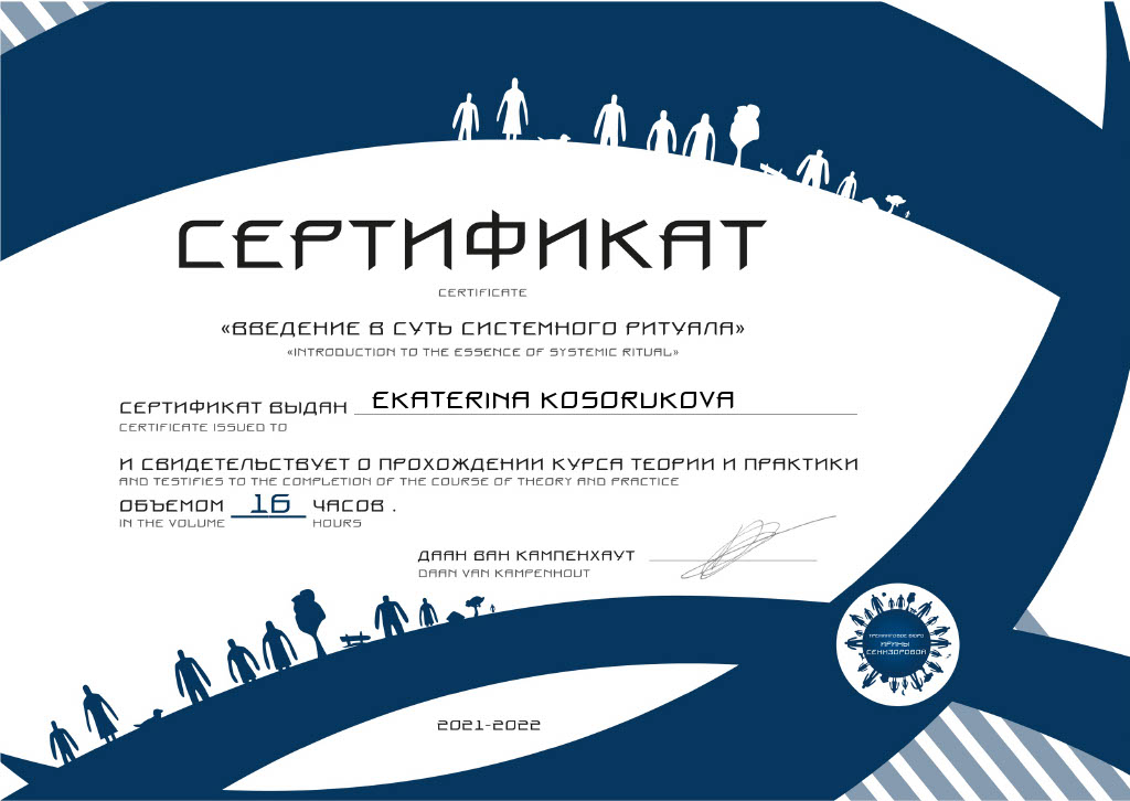 A combination of multiple workshops from leading world renowned facilitators. (400 hours, 170 hours of assessments and practicum). Certificate No: 2023/011 issued by International Family Constellations Training Institute.